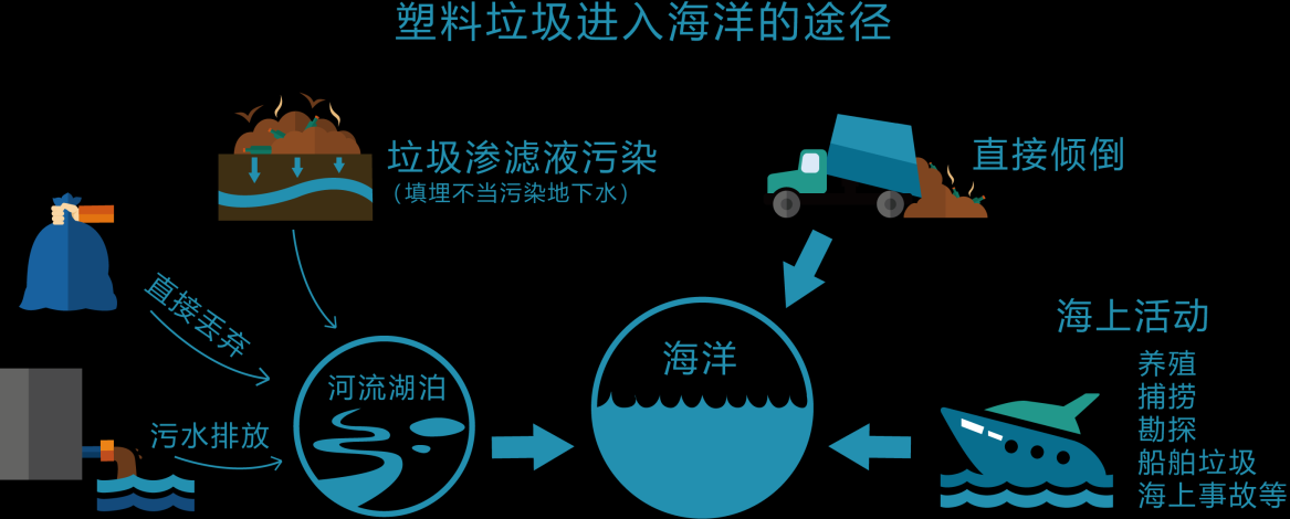 4. 海上活动。包括海上养殖和捕捞,勘探开发,船舶行驶过程中排入的各种垃圾和船舶涂料。一些大型的海上事故,譬如船舶倾覆,原料泄露等也会导致塑料垃圾进入无边无际的大海。