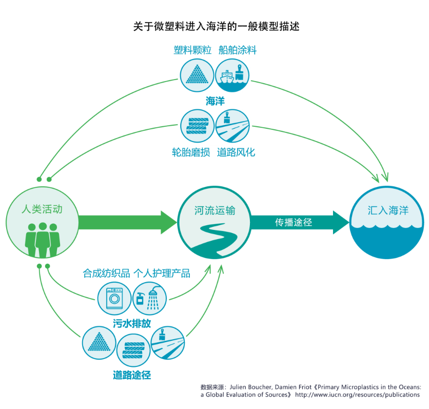 一类是初生微塑料,指经过河流、污水处理厂、道路途径等排入水环境中的塑料颗粒工业产品,如化妆品等含有的微塑料颗粒或作为工业原料的塑料颗粒和树脂颗粒。另一类则是次生微塑料,由大型塑料垃圾经过物理、化学以及生物过程造成分裂和体积减小而成的细小颗粒。这些进入海洋的微塑料颗粒主要是在人类生产活动中进入河流的,包括因风化和事故造成的船舶涂料泄露、轮胎磨损,道路风化、建筑废料等。